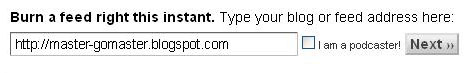 3.Masukan alamat blog anda Pada kotak area kosong dibawah tulisan "Burn a feed right this instant". Berikan tanda ceklis apabila anda seorang podcaster kemudian klik NEXT. Contoh gambarnya seperti berikut :