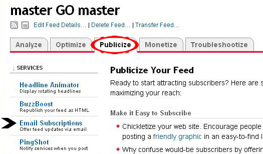 8. Setelah berada di halaman ""Your feed is ready for the world. Now what?"" klik pada PUBLICIZE kemudian EMAIL SUBSCRIPTIONS diteruskan menekan tombol AKTIVATE